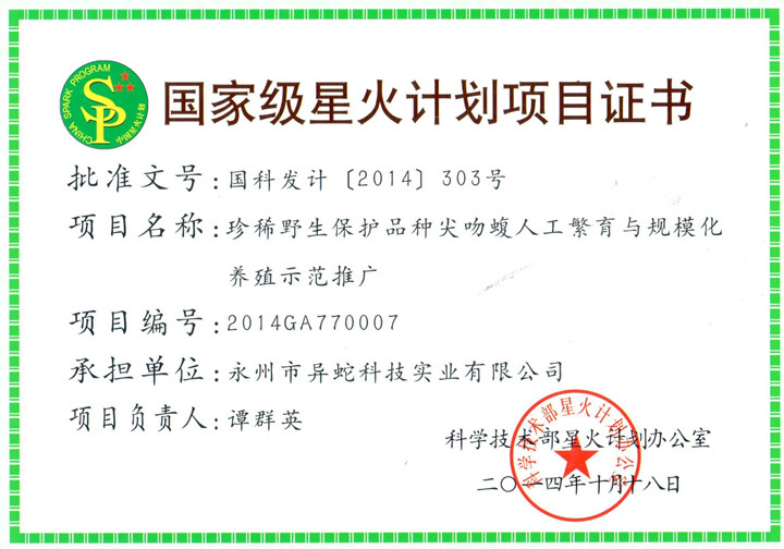 永州市異蛇科技實(shí)業(yè)有限公司《珍稀野生保護(hù)動(dòng)物品種尖吻蝮人工繁育與規(guī);B(yǎng)殖示范推廣》項(xiàng)目被列入國(guó)家級(jí)星火計(jì)劃,該技術(shù)與2015年獲得了湖南省科技進(jìn)步二等獎(jiǎng),填補(bǔ)了國(guó)內(nèi)尖吻蝮蛇人工繁養(yǎng)技術(shù)空白。