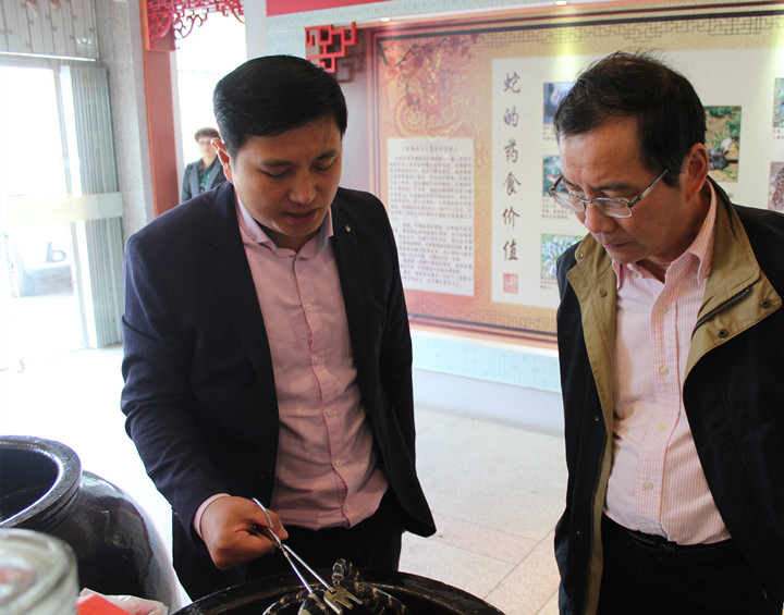 總經(jīng)理郭德志向譚立剛同志介紹公司蛇酒釀泡技藝