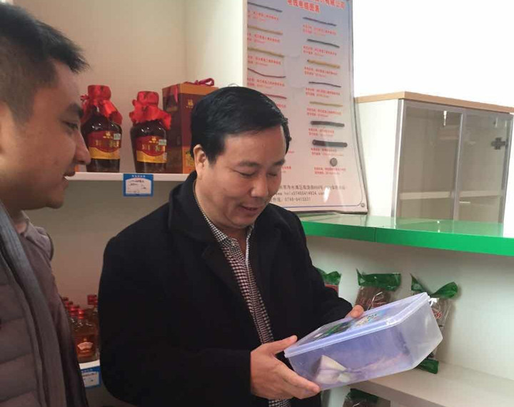 異蛇科技副總經(jīng)理郭德剛向永州市商務(wù)糧食局副局長(zhǎng)李燁介紹公司的生態(tài)甲魚(yú)