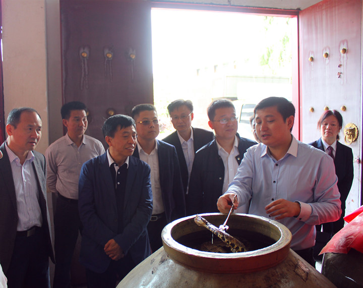 龍建湘一行先后到異蛇科技公司的產(chǎn)品旗艦店、蛇類標本陳列室、釀酒車間、健康水產(chǎn)養(yǎng)殖基地、蛇類繁養(yǎng)基地進行實地調(diào)研。公司總經(jīng)理郭德志向龍建湘一行匯報到:“永州市異蛇科技實業(yè)有限公司是永州的一家老牌企業(yè),二十多年,兢兢業(yè)業(yè),把永州異蛇異蛇科技打造成湖南地區(qū)的林業(yè)、農(nóng)業(yè)龍化企業(yè)、同時柳宗元商標也成為中國馳名商標;公司異蛇王酒、異蛇鞭酒采用的是古法釀泡、現(xiàn)代工藝的釀泡方式,我們的工藝目前獲得了湖南省非物質(zhì)文化遺產(chǎn),這也是政府和消費者對我們企業(yè)最大的認可和鼓勵!同時,我們也正與九芝堂、姿采等華南地區(qū)的制藥口化妝品企業(yè)洽談戰(zhàn)略合作!龍建湘聽完后,對公司的現(xiàn)有的發(fā)展模式及方向表示認可,并提出:企業(yè)的發(fā)展需要兩條腿走路,一個是善研發(fā),一個是懂銷售;研發(fā)是公司穩(wěn)步發(fā)展、與時俱進的基礎保障,銷售又是企業(yè)生存的命脈,作為永州獨特實體企業(yè),異蛇科技需要做產(chǎn)品研發(fā)上花心思,在產(chǎn)品銷售方面找突破口,迎難而上。