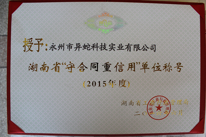為推進(jìn)社會(huì)誠信體系建設(shè),營造“守合同重信用”市場(chǎng)環(huán)境,根據(jù)國家工商行政管理總局《關(guān)于“守合同重信用”企業(yè)公示工作的若干意見》,經(jīng)企業(yè)自愿申報(bào),全省各市州工商局審核推薦,湖南省工商行政管理局征求省相關(guān)部門意見后,決定對(duì)2015年度1798家湖南省“守合同重信用”企業(yè)向社會(huì)予以公示。永州市異蛇科技實(shí)業(yè)有限公司位列其中。