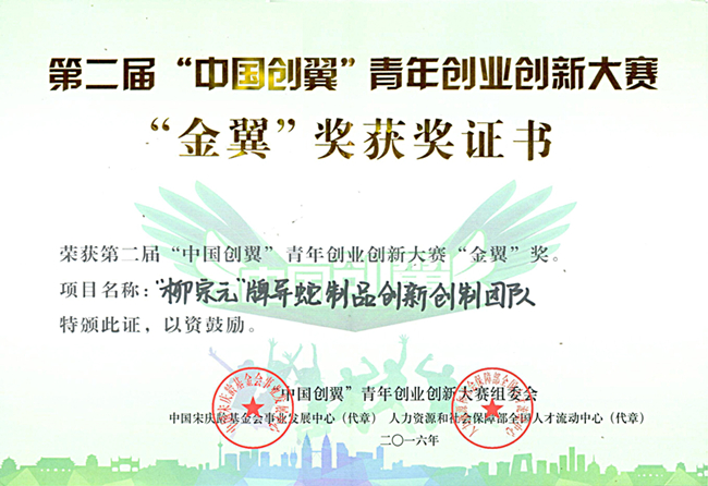 9月8日,由中國宋慶齡基金會和人社部聯(lián)合主辦,河北省人社廳承辦的第二屆“中國創(chuàng)翼”青年創(chuàng)業(yè)創(chuàng)新大賽綜合類總決賽在石家莊落下帷幕。全國27省(市、區(qū))決賽中選拔的133個創(chuàng)業(yè)創(chuàng)新項目,經(jīng)過半決賽激烈角逐,永州市零陵區(qū)選送的“柳宗元”牌異蛇制品等20個團隊晉級團隊組全國總決賽。在總決賽中,被大賽組委授予“中國創(chuàng)翼”青年創(chuàng)業(yè)創(chuàng)新大賽“金翼”獎。