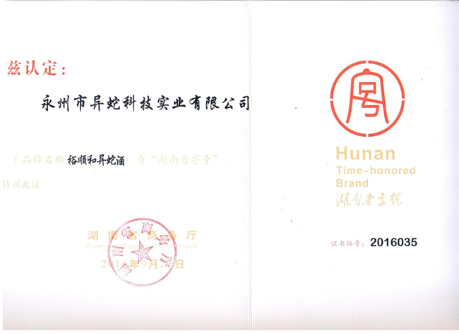 2016年9月20日,湖南省商務(wù)廳網(wǎng)站公布了第三批“湖南老字號(hào)”名單。其中,由我市商務(wù)和糧食局推薦的永州市異蛇科技實(shí)業(yè)有限公司“裕順和異蛇酒”經(jīng)專(zhuān)家組評(píng)審,被認(rèn)定為“湖南老字號(hào)”。