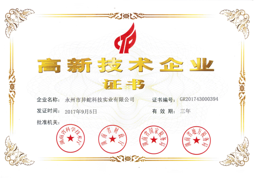 經(jīng)公司申請(qǐng),湖南省高新技術(shù)企業(yè)認(rèn)定機(jī)構(gòu)辦公室組織專家評(píng)審、審查認(rèn)定永州市異蛇科技實(shí)業(yè)有限公司為高新技術(shù)企業(yè)。