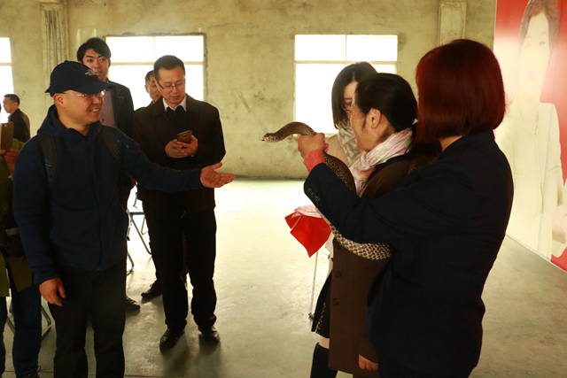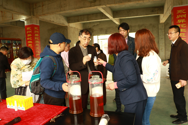 在景區(qū)內(nèi),日本游客興致勃勃的參觀蛇類養(yǎng)殖基地,近距離地與蛇進(jìn)行親密接觸,詳細(xì)了解蛇類產(chǎn)品的生產(chǎn)和研發(fā)過程,還饒有興趣的詢問永州異蛇文化。“參觀異蛇世界和體驗異蛇文化是件非常有趣的事情,我從中了解到很多關(guān)于永州異蛇的故事!眮碜匀毡镜囊幻慰驼f,這是他第一次接觸永州異蛇文化,這個過程很有趣,令人難忘。